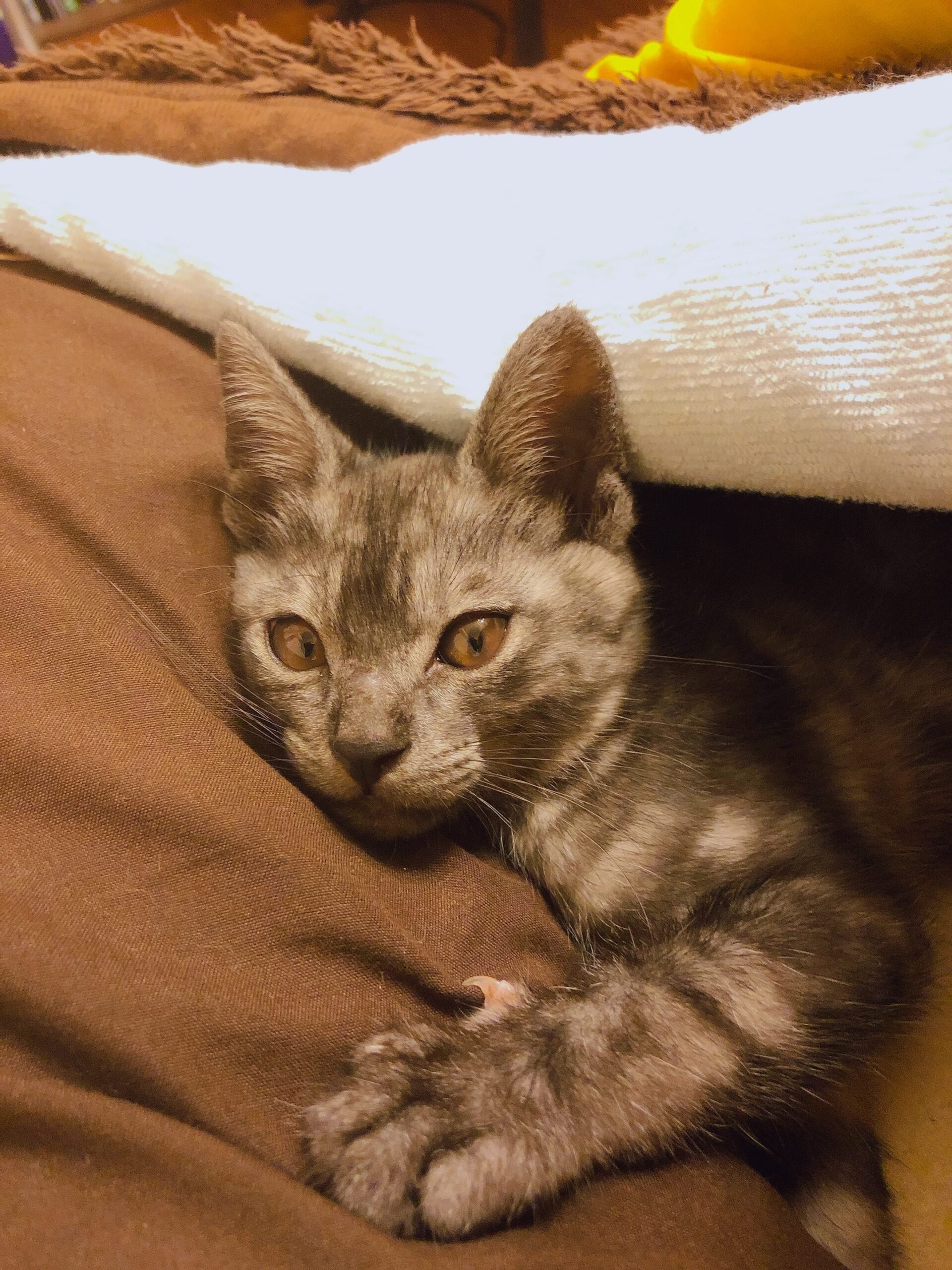 以前保護した猫が人間になかなか慣れず、慣れるまで様子を見ていたところ病状が悪化して衰弱してしまったことがありました。なので今回は拾ってそのまま直ぐに動物病院へ直行しました。人馴れしていない子猫のため、キャリーケースから出さずに目診。生後2ヶ月、離乳はしている、性別は触らないとわからないと言うことで、ひとまず健康そうで安心。予防接種などは生後3ヶ月からなので、1ヶ月後の予約をとって帰ってきました。