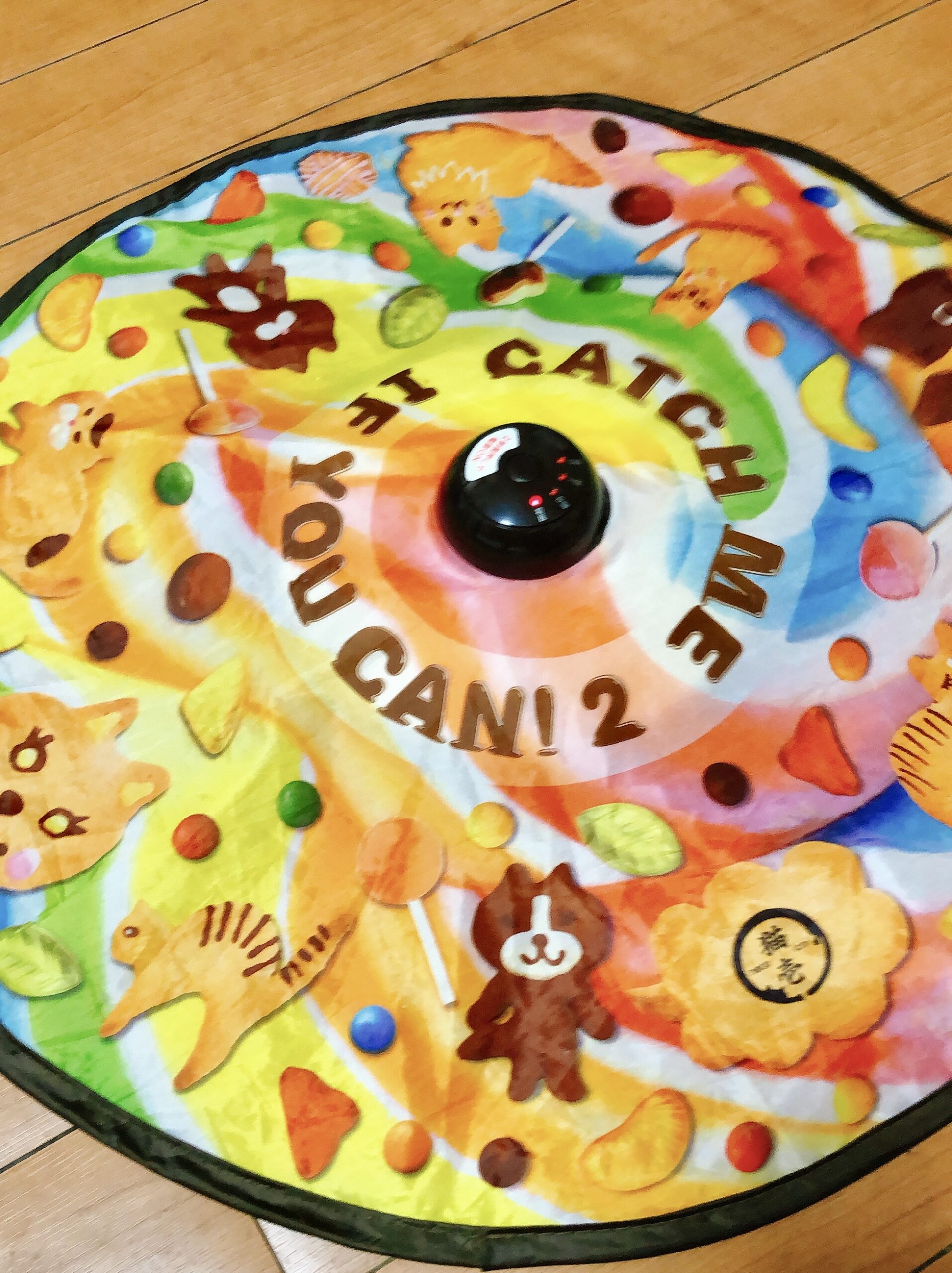 CATCH ME IF YOU CAN!2 を一言で表すと「全自動猫じゃらし機」です。モーターに猫じゃらしが付いており、くるくると変則的に回転することで猫を飽きさせずに引きつけます。操作は真ん中の丸いボタン一つでモードを切り替えられます。電源は電池式で、単三電池が4本必要です。猫じゃらしは2本ついてきます。シートのデザインも可愛い!というわけで早速電源をON