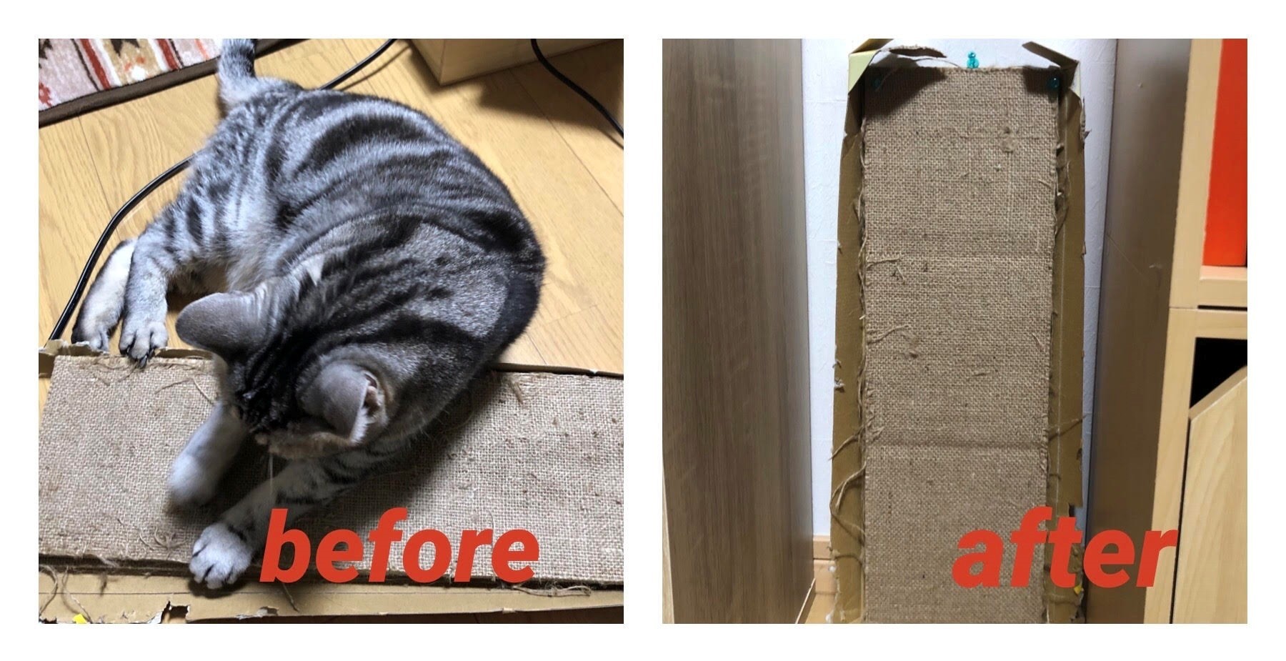 そのことから使っていた爪とぎを壁に立て掛け固定し、安定感と高さの条件をクリアしました。