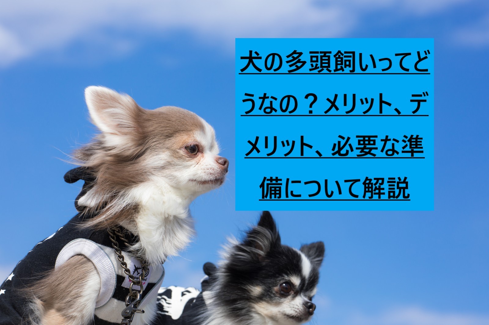 →エサ代・医療費・トリミング代などが犬の数分増えます。さらに毎月にかかる費用+犬の調子が良くないときは医療費が掛かります。また異性の場合、避妊・去勢をしなければ妊娠する可能性があります。妊娠すると定期的に獣医に行き、出産費用が更に掛かります。出産したあとも犬は多産なので、引き取り手が数匹いないという可能性も高いです。その場合やはり飼い主が責任をもって育てることになります。